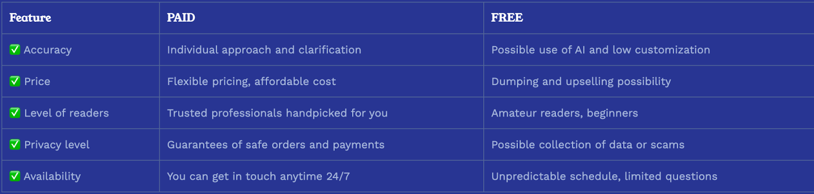 At TarotAtlas, you can order both free and paid reading sessions. To clarify what the processes are all about, we’ve provided the table below (taken from the company’s website):