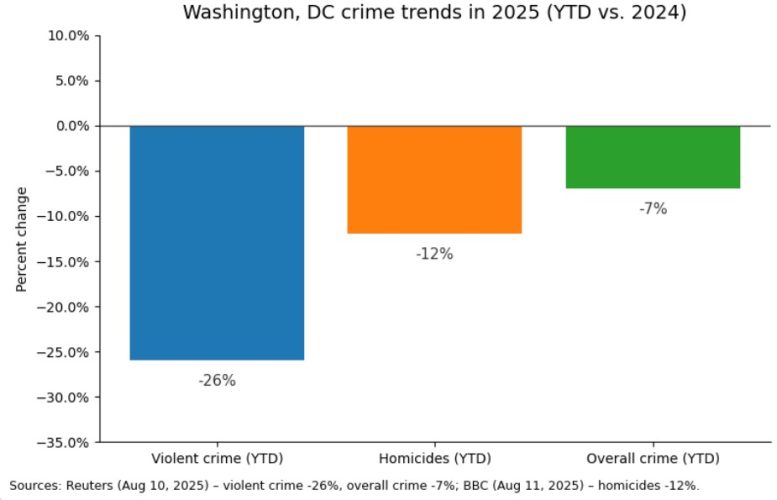 Alt text: Bar chart showing DC crime changes year-to-date vs. 2024: violent crime approximately −26%, homicides approximately −12%, overall crime approximately −7%.