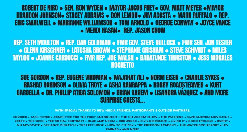 The speaker lineup reads like a casting call for everyone in America with a public grudge against this administration. Robert De Niro headlines, bringing the same blunt-force energy that has made him one of Hollywood’s most vocal Trump critics. He is joined by actor Mark Ruffalo, voting rights leader Stacey Abrams, journalist Jim Acosta, former CNN host Don Lemon, conservative-turned-critic George Conway, legal analysts Joyce Vance and Glenn Kirschner, and journalist Mehdi Hasan.