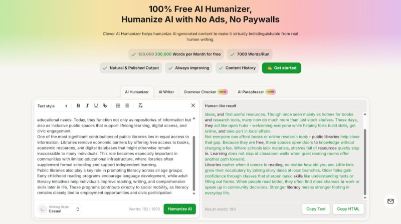 Clever AI Humanizer runs as a browser tool with a genuinely detailed feature list on its site. It is a 100% free AI humanizer with no ads and no paywalls. It offers usage limits of up to 200,000 words per month and 7,000 words per run.