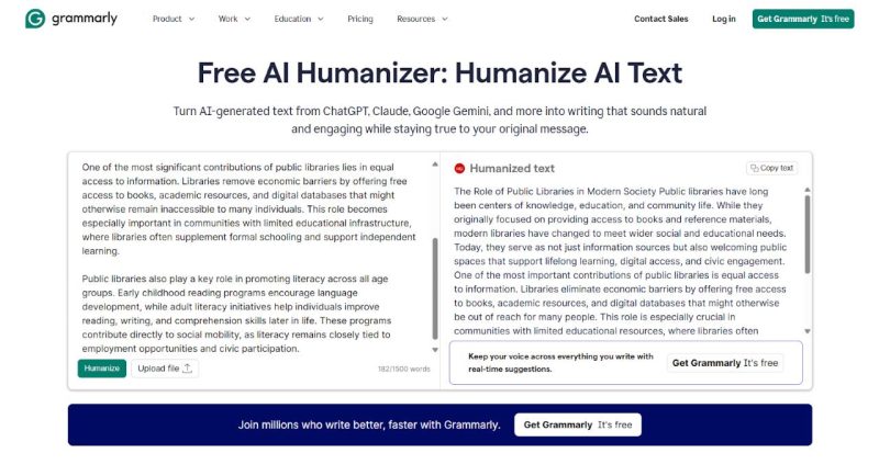 Grammarly AI Humanizer is an AI-generated text humanizer, integrated into Grammarly’s broader writing assistant, and focuses on improving clarity and correctness rather than altering structure aggressively. It works alongside Grammarly’s grammar engine, tone adjustment, and style consistency tools, with access levels depending on whether the user is on a free or paid Grammarly plan.
