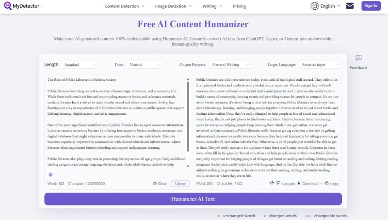 The last in our list is My Detector AI Humanizer. It combines rewriting with fine-grained controls over output behavior. It allows large inputs, supports tone and length adjustments, and includes the ability to freeze specific words or sentences so they remain unchanged during rewriting. File uploads and multi-language output are supported.
