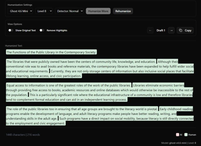 The humanizer rewrites text to sound more natural while keeping sentence logic intact, which makes it suitable for academic and professional writing.